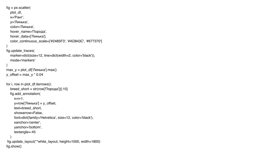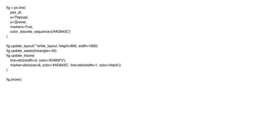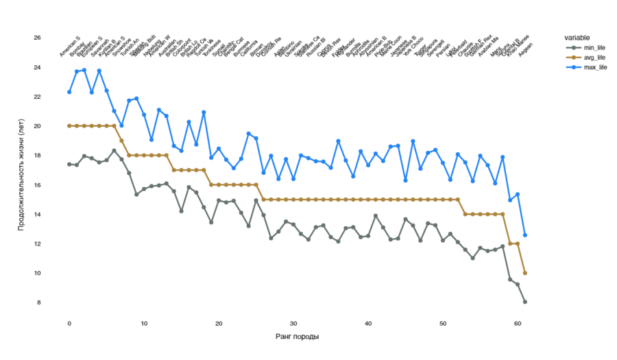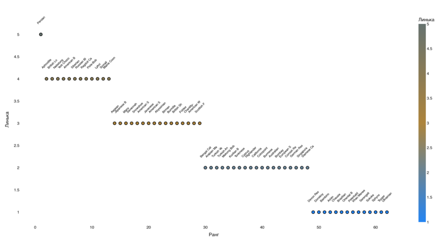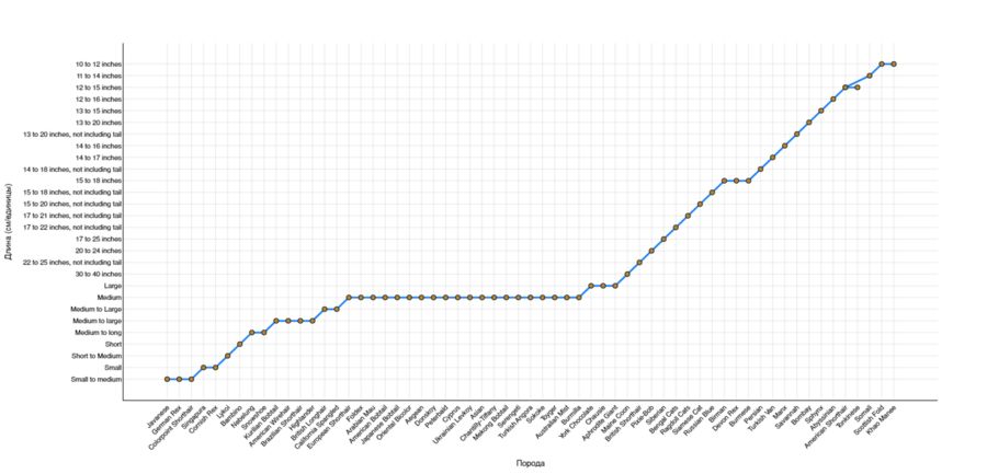 Размер животного — важный показатель для многих людей, поэтому я собрала данные о размерах пород в точечный график от меньшего к большему. График наглядно показывает амплитуду разности размеров котов.
