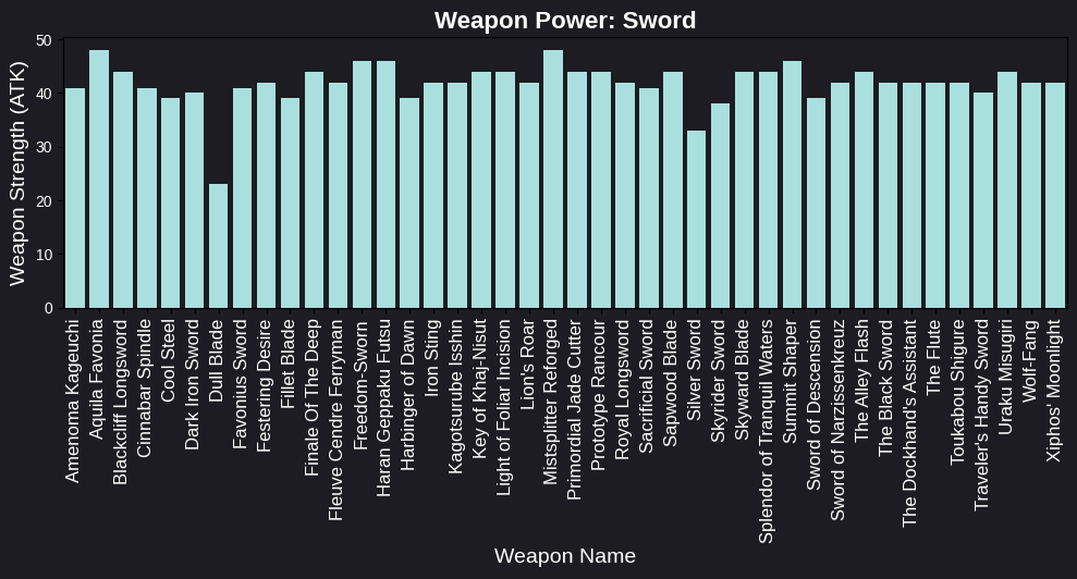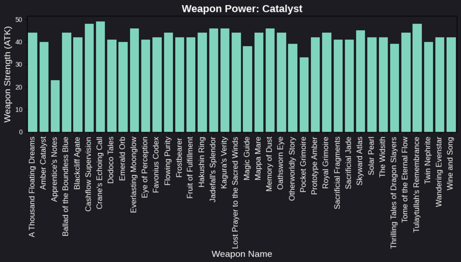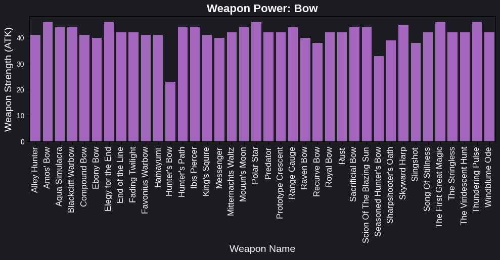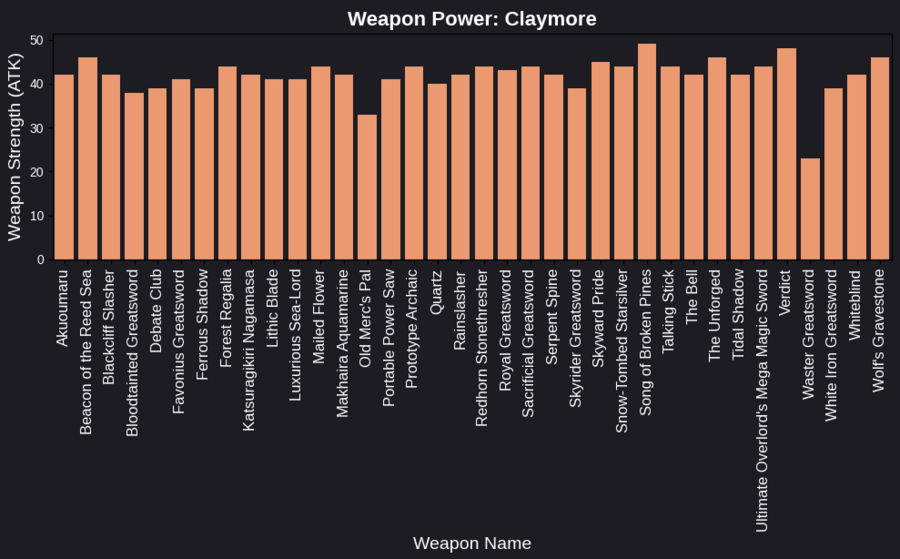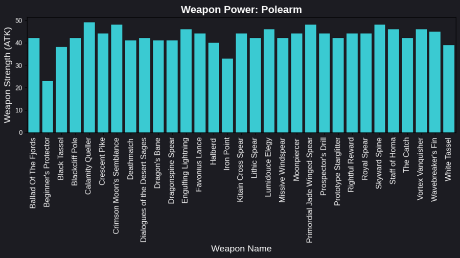 Когда я создавала графики для каждого типа оружия, я использовала отдельные столбчатые диаграммы для отображения базовой силы (атаки) каждого оружия. Графики представлены в отдельных подграфиках, что позволяет легко сравнить их характеристики.