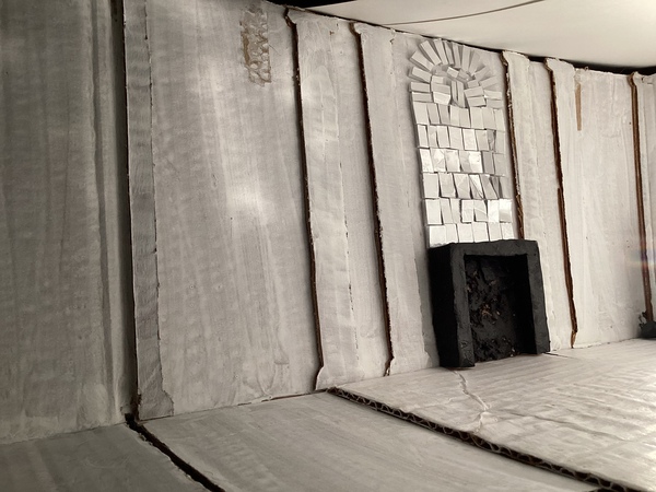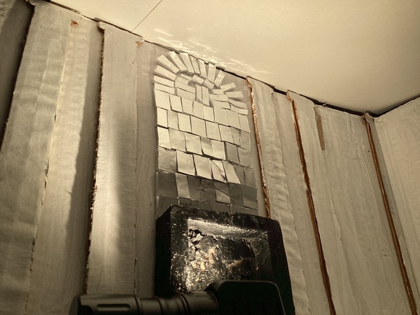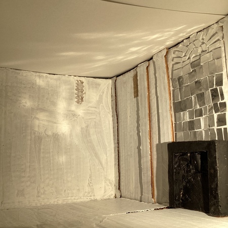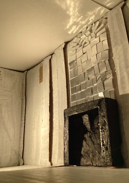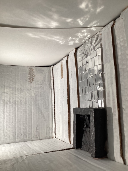 Моя инсталляция посвящена главному помещению всей усадьбы — бальной зале. В своё время она являлась центром светской жизни, в которой проводились пышные мероприятия. Значимым элементом этой залы были два камина с зеркальными мозаиками, которые, находясь друг напротив друга, освещали всё пространство.
