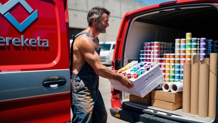 Промпт: A red van with the Vereketa company logo. The loader unloads paints and paper from it.