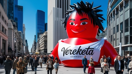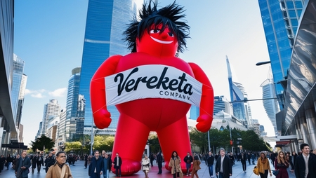 Промпт: A large inflatable red man with black hair in the city center advertises the Vereketa company