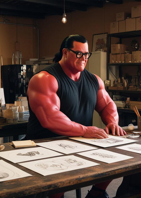 Промпт: The production workshop of the Vereketa company. A big red man with black hair draws custom illustrations while sitting at a large table.