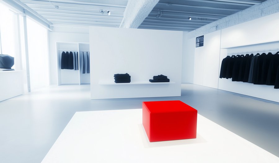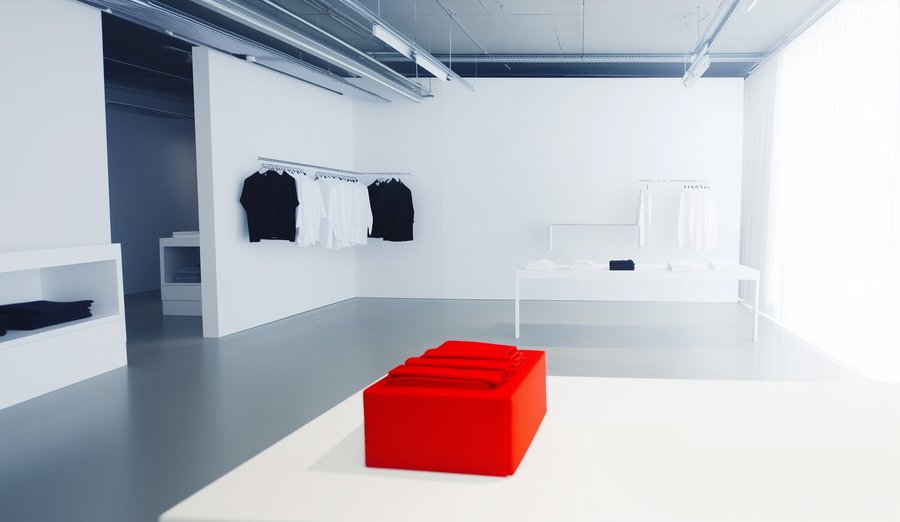 Prompt: Visual image of the minimalistiс fashion design store Location: a minimalistic loft-style room white walls color scheme only shades of gray, white, and red as an accent color. Bright accents in the form of accessories, and finished products add brightness. Atmosphere: creative atmosphere the visual image of the store creates a sense of creativity, freedom, and professionalism. New ideas are born, unique clothing collections are created, and fashion designers gain valuable experience. Comme des garsons store style, white cube grey floor.