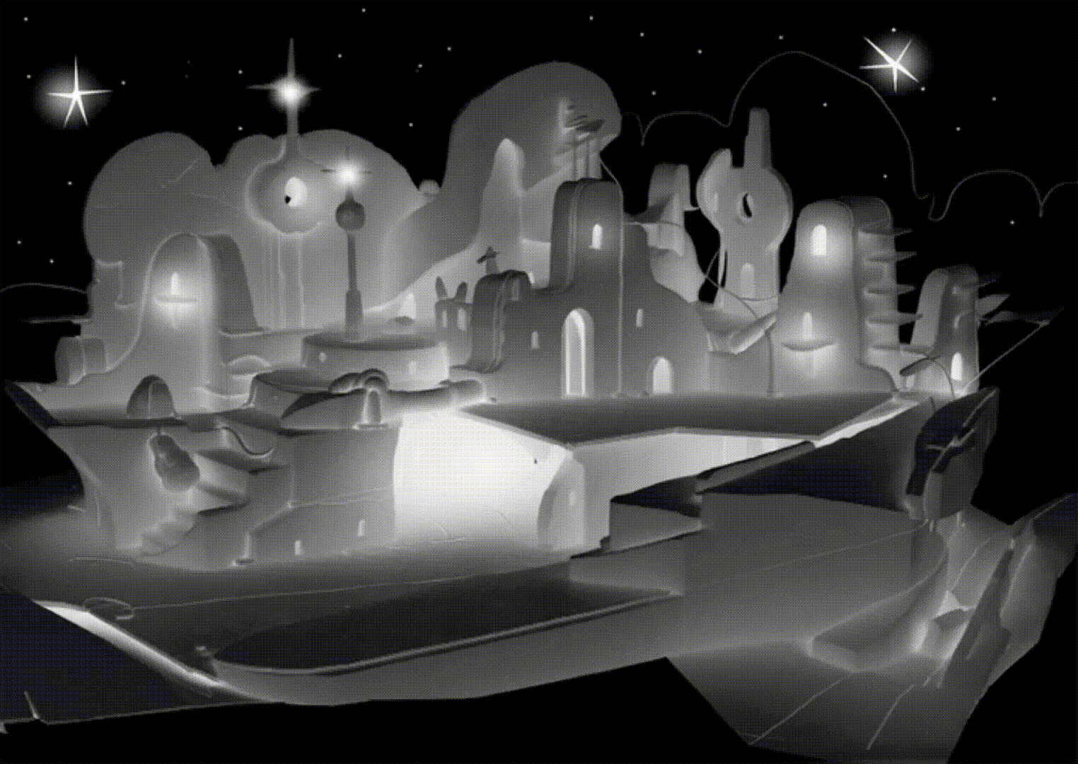 Каждый кусочек локации — это жилища жителей, пратсов. Через эти хрустальные постройки проходит энергия, материал, который добывается на «Месте падения Звезды». Через дома пратсы заряжают свои сердца-батарейки.