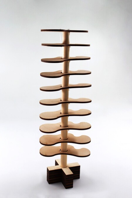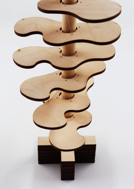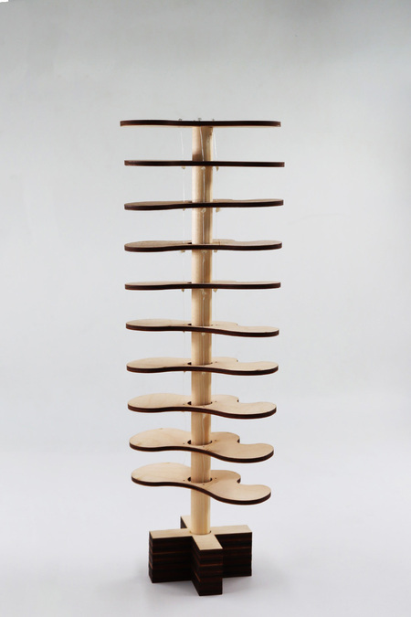 Плавные, текучие линии образуют здесь сложные и таинственные фигуры, воплощая идею многослойности, столь значимую для художественного поиска Ханса Арпа. Вдохновленная его творчеством, я интегрировала эти элементы с принципами кинетической архитектуры. Когда вы начинаете медленно поворачивать рейку у основания, она приводит в движение остальные фигуры, увлекая их в спокойное и гармоничное перемещение. Каждая следующая фигура слегка отклоняется от предыдущей на пять градусов, создавая эффект непрерывного вращения. Таким образом, с помощью переосмысления рельефа Ханса Арпа я раскрываю одну из ключевых тем его творчества — метаморфоза, непрерывные процессы движения в природе.
