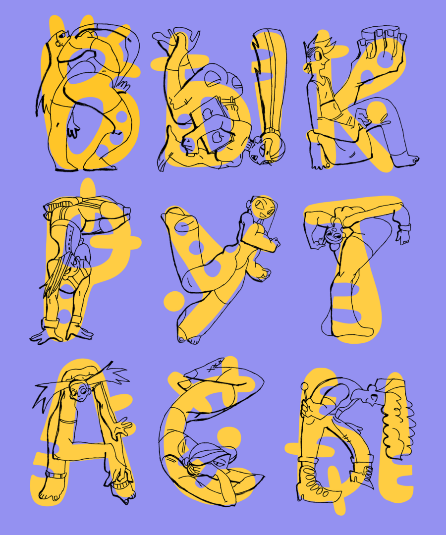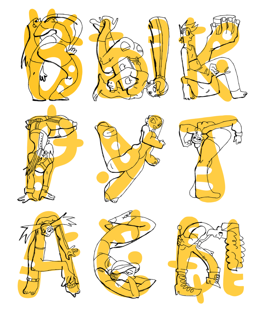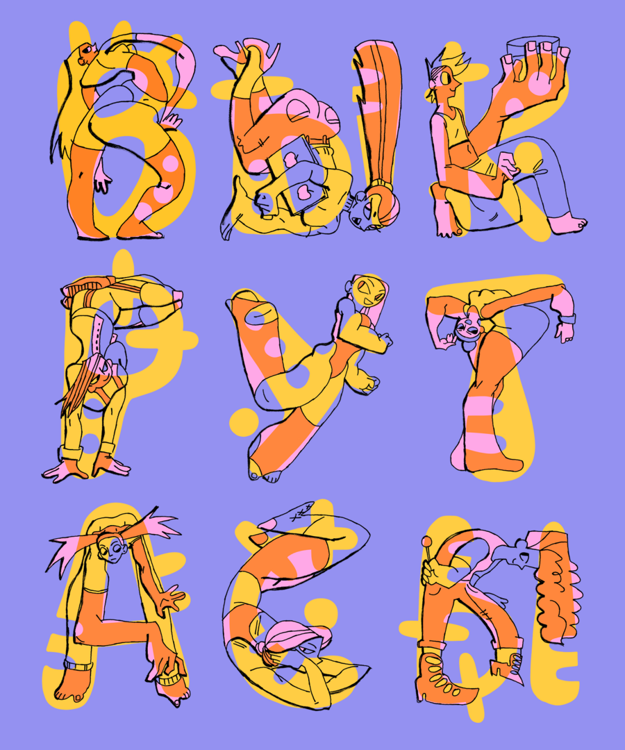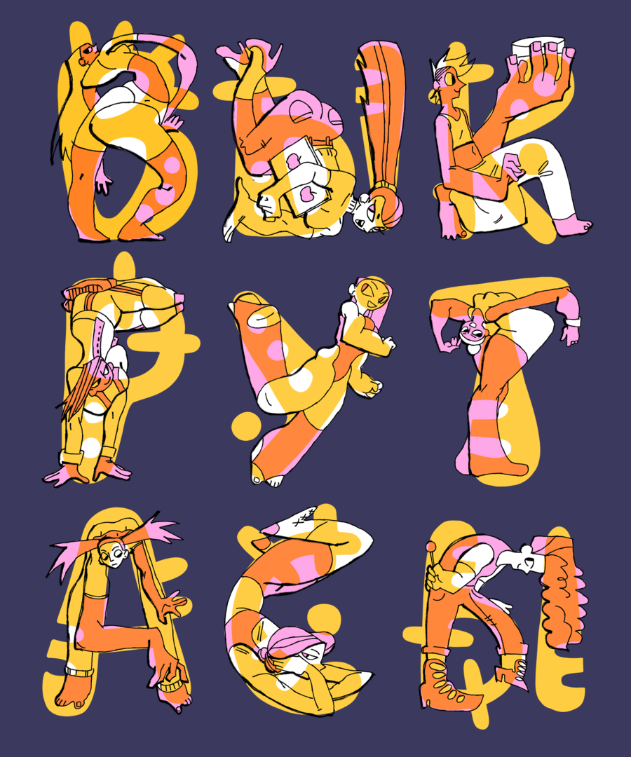 Серия ярких буквиц, складывающийся в слово «ВЫКРУТАСЫ». Вдохновлена молодёжными тусовками. Буквицами можно обозначить крутую тусу, а ещё иронично надеть футболку с ними на какое-нибудь светское мероприятие.