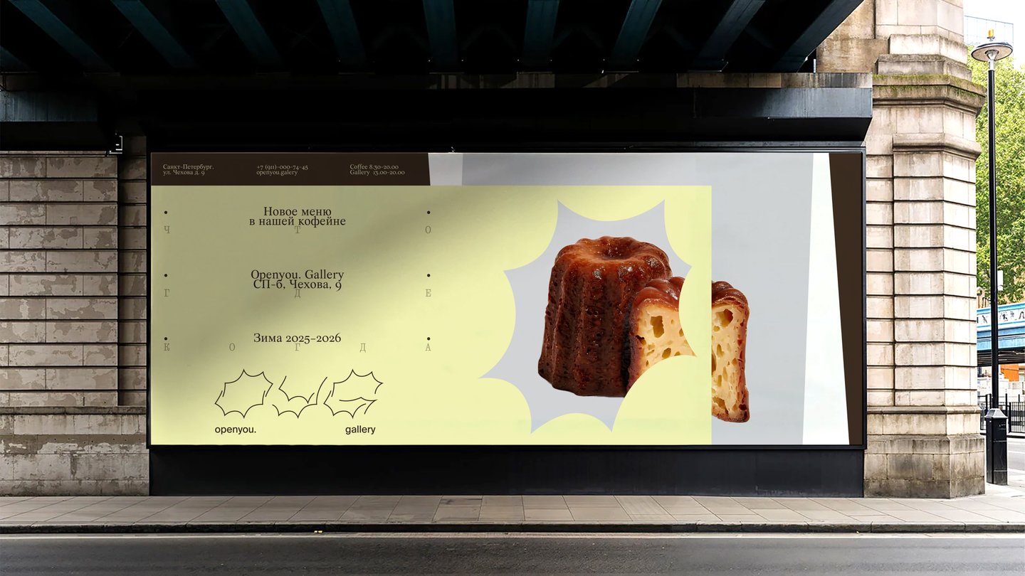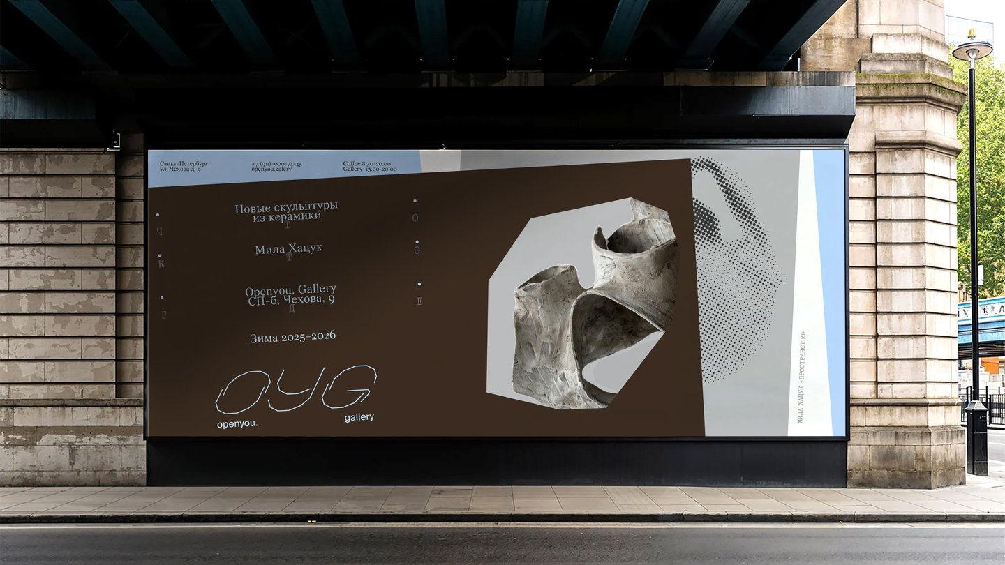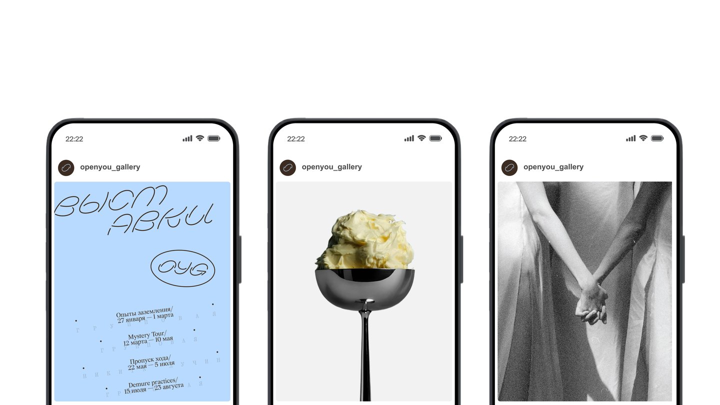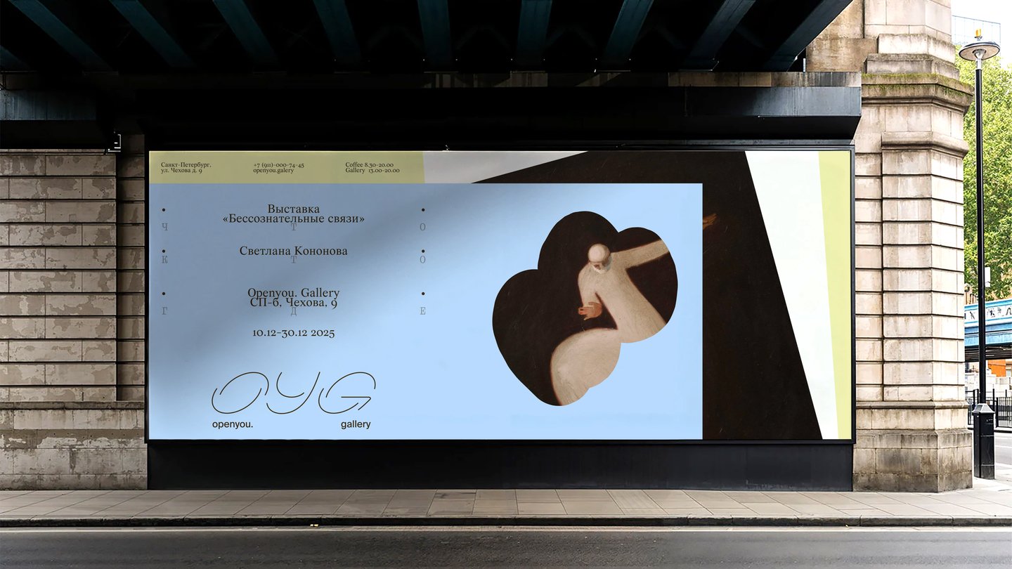 Айдентика петербургской галереи современного искусства Openyou.Gallery. Особенность галереи — в синтезе арт-площадки, концепт-стора и кофейни, делающем Openyou городским пространством нового формата. В основе фирменного стиля — кастомный шрифт, ассоциирующийся со слом привычного фокуса, многослойности и маски, сквозь которых мы можем смотреть на мир по-новому, открывая свою жизнь искусством.