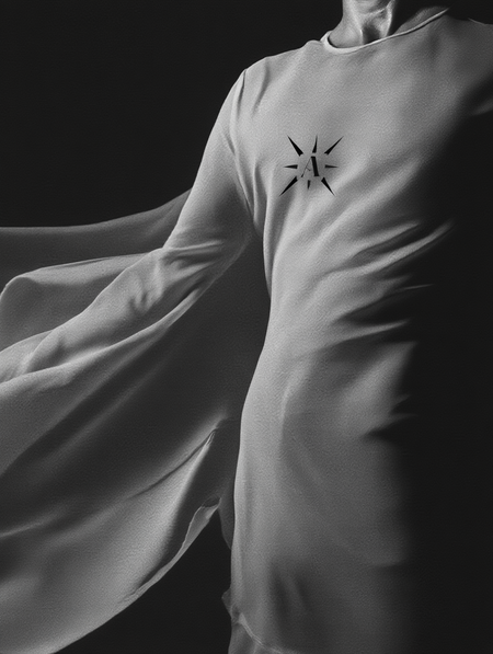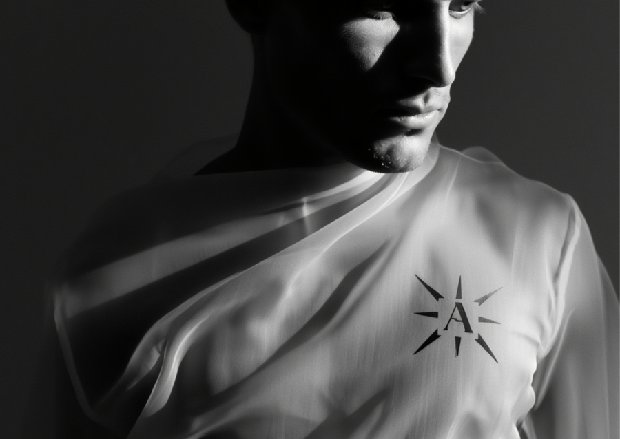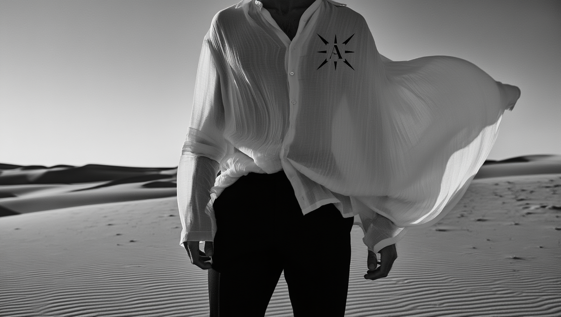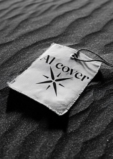 Список используемых промтов для генерации изображений: 1. ЛОГОТИП. Создай современный минималистичный логотип для бренда Al cover — производителя одежды из легких натуральных материалов для жаркого климата. Бренд вдохновлен культурой пустыни и образом людей, странствующих под солнцем. Визуально передай легкость, воздух и тепло натуральных тканей. Основные ассоциации: песок, ветер, ткань, солнце, караваны, движение. Стиль — чистый, уравновешенный, минималистичный. Избегай перегруженных деталей. Шрифт — лаконичный, с мягкими округлостями, передающий естественность и гармонию, но в тоже время премиальный. Атмосфера — знойная, спокойная, натуральная. Логотип должен быть черным на чистом белом фоне. 2. ЗНАК Посередине иконки логотипа изобрази белый квадрат. Увелич букву «А» и поставь ее посередине квадрата. Остальной текст убери. Ничего не меняй в остальном изображении. 3. БИРКА Generate the image of the cloth tag lying on the sand in the desert. place this logo on it. u can not change the image. hyper realism, vintage style, black and white filter 4. Плакаты с тканью Generate an image of a poster hanging on a stone wall of a house for a clothing brand made of natural materials for a hot climate. The poster should feature an image of a light, translucent fabric floating in the wind, with an approximate composition and a full-size image of the fabric. High contrast, black and white filter; large grain. In the middle of the poster should be placed this image (изображение логотипа). You can not change it. 5. Термос Generate an image of the thermos covered by the gradient of black and white waves with the noise texture. at the bottom part of it should be placed the small picture of this logo. you can not change it. 6. Пакет Generate an image of the shopping bag covered with the gradient pattern of black and white waves with the noise texture. Place this logo in the top of the bag. you do not allowed to change it. The bag should be placed in the sand in the desert. Hyper realism, black and white filter, contrast lighting. 7. Одежда на мужчинах Generate an image of a guy wearing a long-sleeved shirt made of light, semi-transparent fabric that billows slightly in the wind. Photorealism. Contrast lighting, graininess, and a black-and-white filter. This logo should be located on the chest in the upper-right corner.
