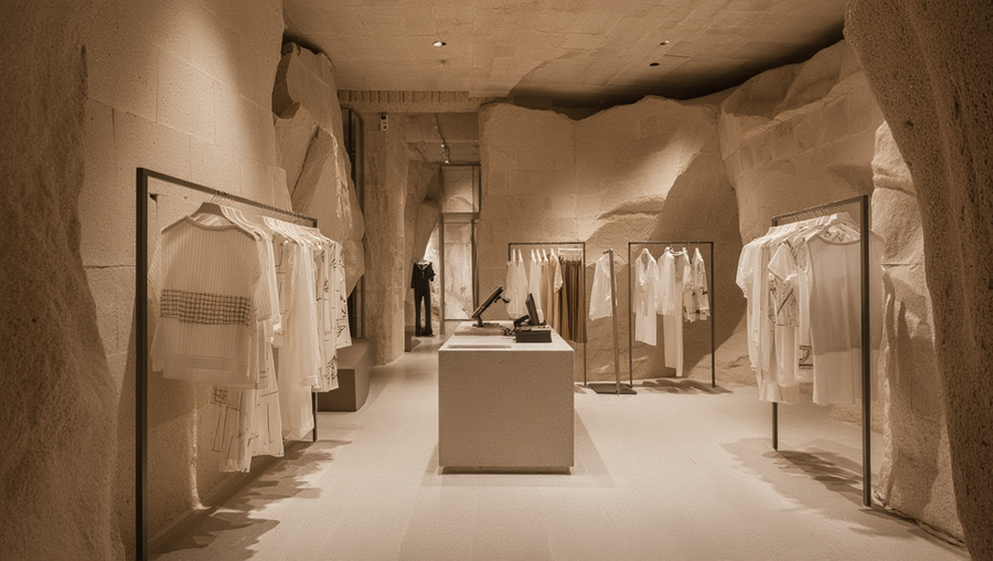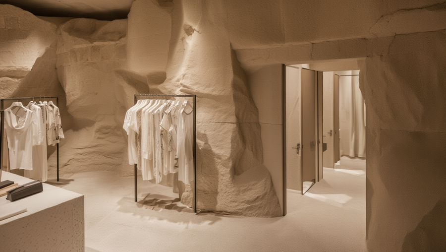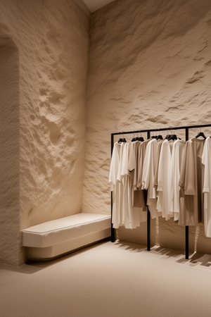 8. Платок на женщине Generate a close image of a woman wearing a dress made of light, semitransparent fabric that slightly develops in the wind. Photorealism. contrasting lighting, graininess, black and white filter. This logo should be located on the chest in the upper right corner. It should be small you can not change the uploaded image. 9. Постер 1)Generate a poster with the close image of the show through light cloth with a high contrast. Add noise effect. 2)Add a text «We’ll hide you from the heat» to this image place it on the left bottom corner using times new roman font. Also add a small picture of this logo, place it in the middle on top of image. 3)Create a mockup of the poster of this image placed on the street of the area near the desert. Hyper realism black and white filter. 10. Пространство Generate a space for a clothing store made of natural materials for hot weather Al cover. The space has a cash register and hangers with clothes made of light, semi-transparent materials. The space is large, with a free layout, and the walls are made of natural, unprocessed, light-colored stone, as if the store is located inside a cave. The space feels airy, free, and cool. The style is hyperrealistic. The combination of Scandinavian and Eastern styles. The space has a high contrast and a black and white effect.