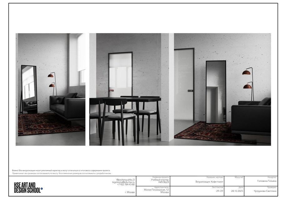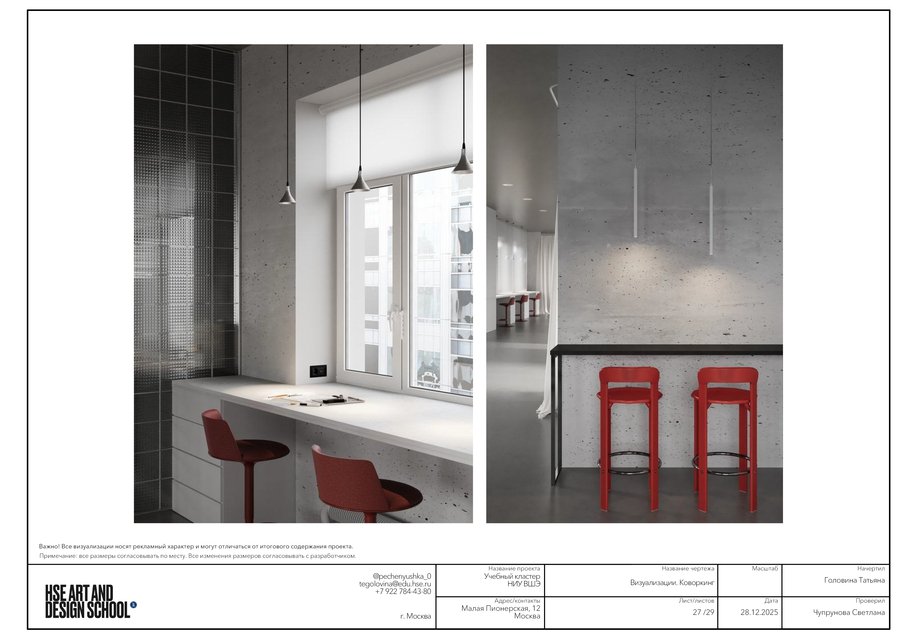 Дизайн-проект направлен на преобразование учебного кластера для студентов, изучающих дизайн среды и интерьера. Функциональные решения были разработаны с учетом потребностей студентов, а стиль — под влиянием промышленного прошлого здания корпуса. Альбом чертежей является закономерным этапом работы над проектом и раскрывает его конструктивную составляющую.