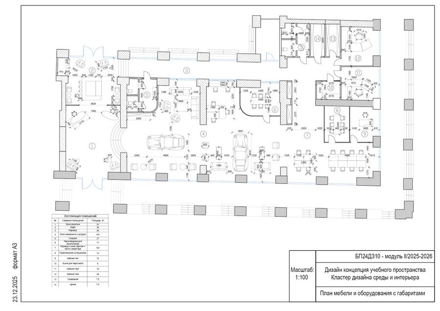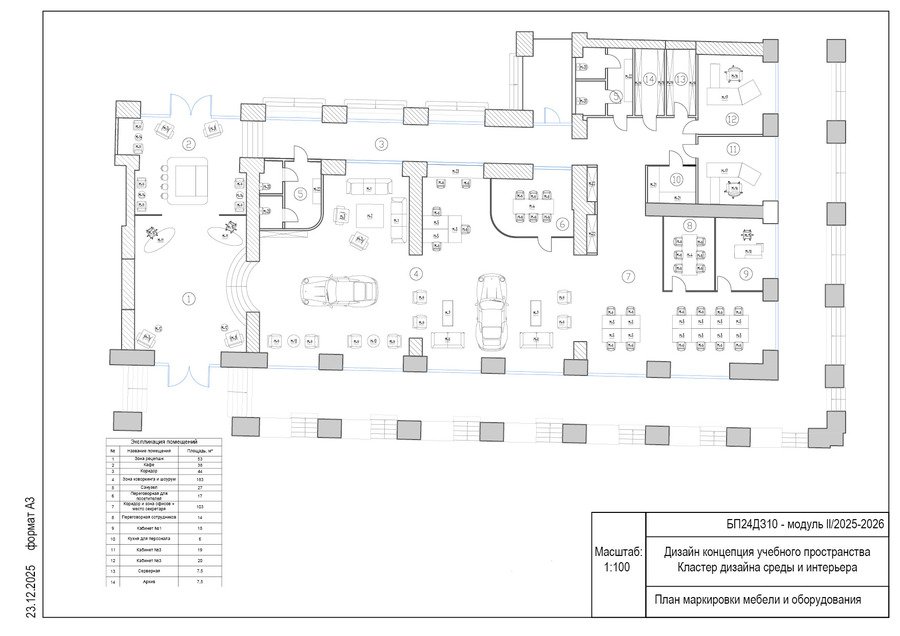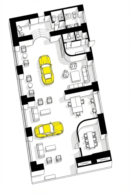 Данная работа содержит множество разновидностей планов к моему основному проекту. Это место, где объединены коворкинг, офисы, кабинеты, кафе и сменная выставка автомобилей. Главная цель — создать комфортную среду для работы и отдыха, где главным элементом интерьера являются интересные машины.
