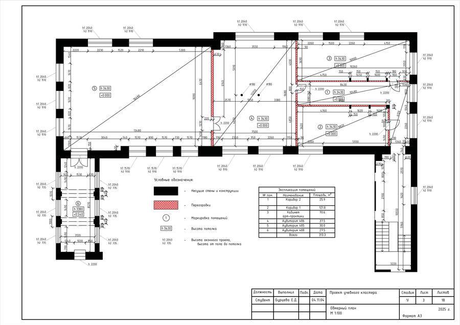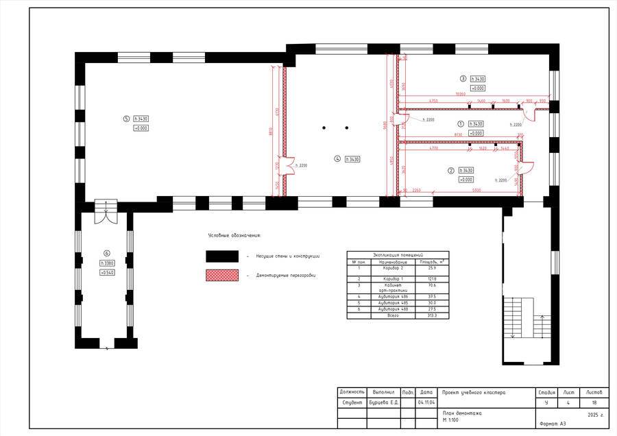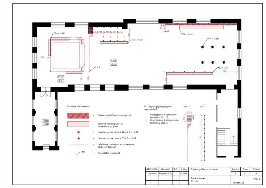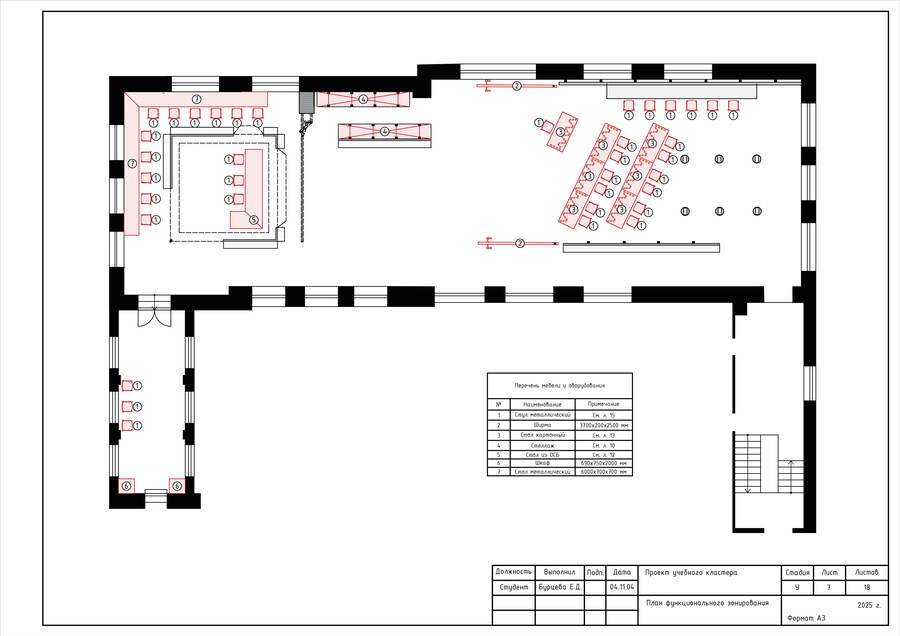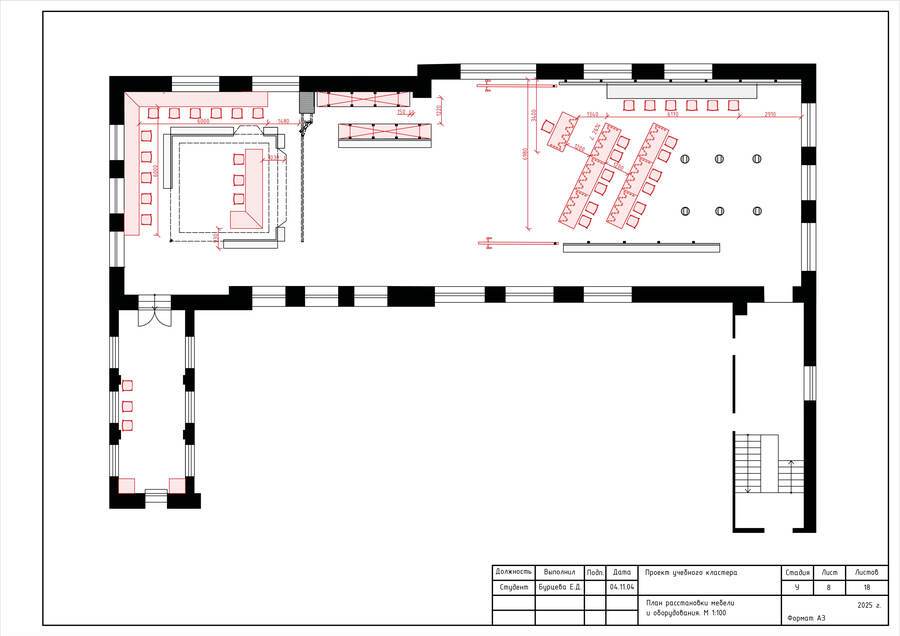Проект учебного кластера основан на принципах открытой, гибкой и трансформируемой пространственной организации. В рамках концепции выполнен демонтаж существующих перегородок с формированием единого открытого пространства (open space), адаптируемого под различные форматы образовательной деятельности. Планировочные и конструктивные решения направлены на обеспечение вариативности использования среды, возможности быстрой трансформации и визуальной целостности пространства, отвечающей задачам современного образовательного процесса