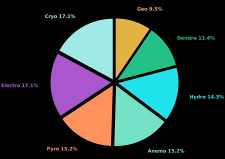 Для оформления графиков я использовала цветовую палитру, основанную на цветах всех элементов игры Genshin Impact. Подбор кодов цветов осуществлялся с помощью нейросети Deepseek, что позволило сохранить визуальные ассоциации с оригинальной стилистикой игры. В качестве фона был выбран чёрный цвет, так как он лучше всего сочетается с большим количеством ярких оттенков, усиливает контраст и делает визуализации более читаемыми.