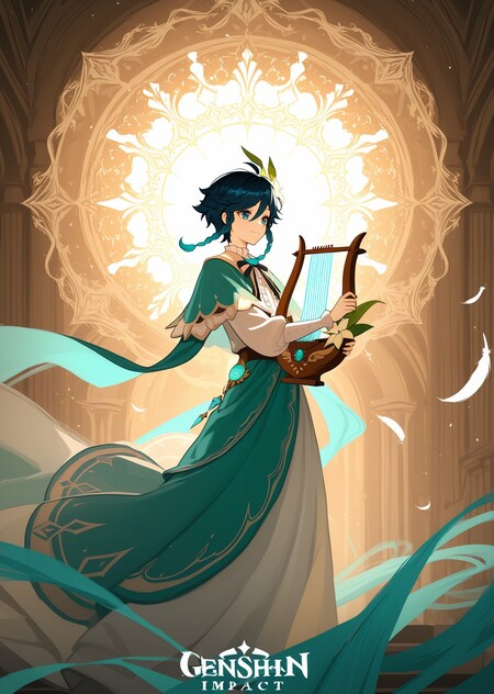 Венти, Дилюк, Итер, Джин и Паймон — официальные обои для рабочего стола Genshin Impact