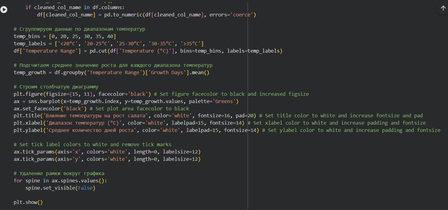 Из графика можно сделать вывод, что наибольшее количество дней роста соответствует диапазону температур 25-30 °C, следовательно, этот диапазон плохо подходит для выращивания салата-латука, потому что он отрицательно сказывается на его скорости роста.