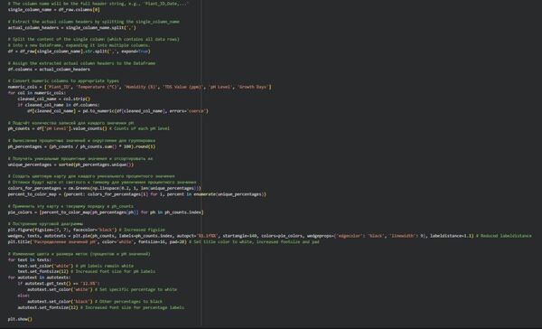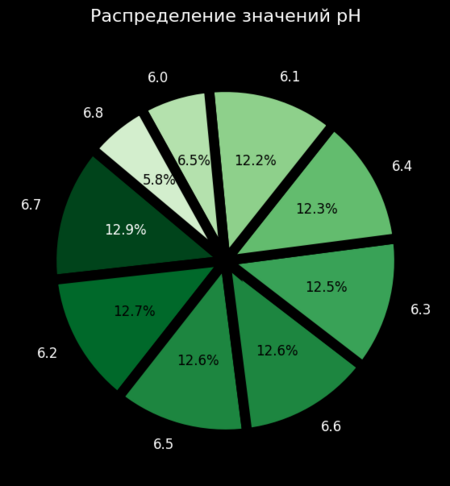 Проанализируем другие факторы роста. На круговой диаграмме ниже представлено распределение значение pH в процентном соотношении. PH — единица измерения кислотности почвы. Значение pH может отличаться даже в пределах одного огородного участка, поэтому важно понимать то, в какой среде происходил сбор данных и какие значения кислотности почвы в ней можно обнаружить.