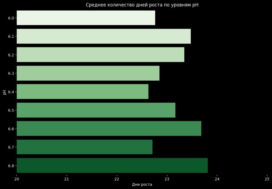 Судя по гистограмме, наибольшее количество дней роста соответствует кислотности 6.8 pH. Эта кислотность отрицательно сказывается на скорости роста салата-латука. Значение pH соответствующее самому быстрому росту салата — 6.4 pH, из графика 3 можно заметить, что этому значению соответствует только 12,3% земли, попавшей в выборку данных.
