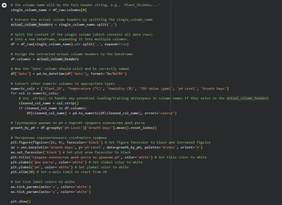 В рамках исследования можно было бы продолжить анализировать другие параметры среды (влажность, TSD или подобрать датасет с большим количеством параметров, например, тот, в котором учтён световой день). Тем не менее, главный вопрос исследования закрыт — среда, в которой проводили сбор данных, неидеальна (как минимум, по 2 параметрам из 4), но это не означает, что выбранное для исследования место категорически не подходит для эффективного взращивания салата-латука, к чему нас отсылает вывод из графика 5.