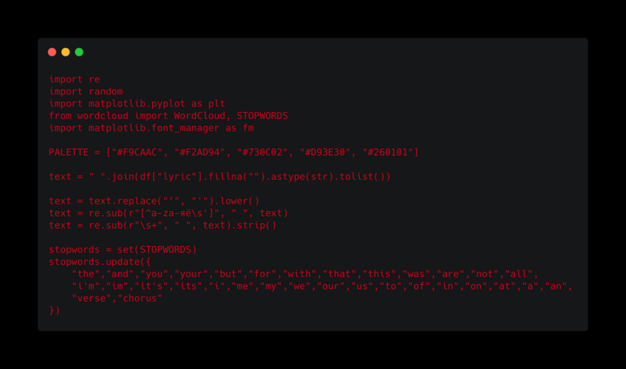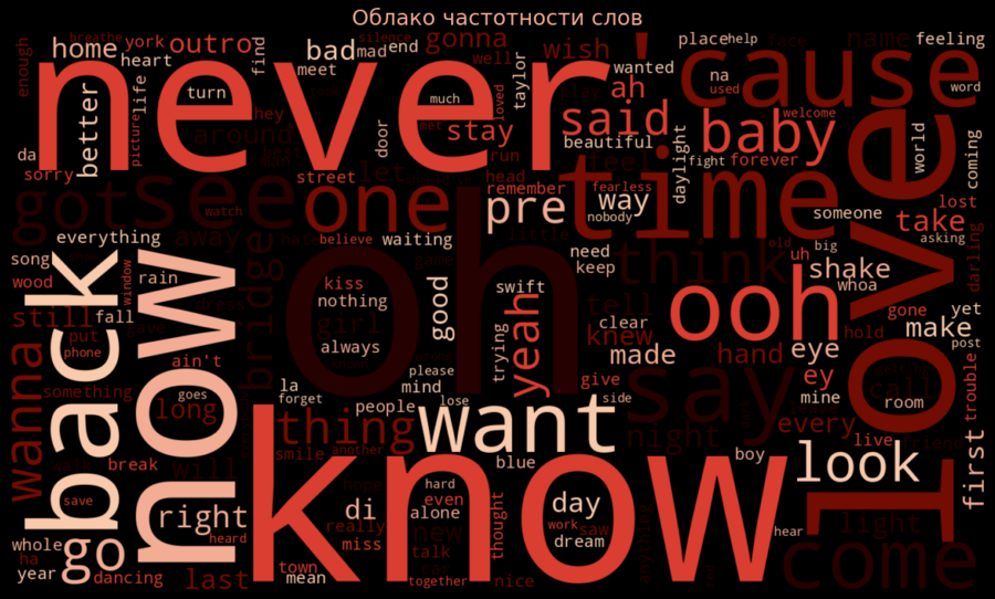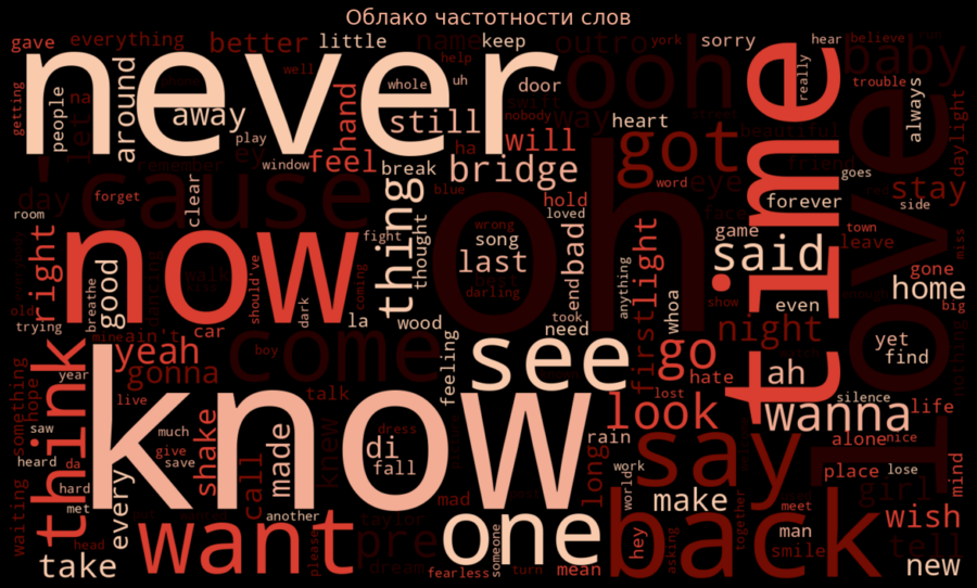 В завершение анализа я обобщил работу с текстами и посмотрел, какие слова в песнях Тейлор Свифт встречаются чаще всего в целом. Для этого я построил облако слов, предварительно очистив тексты от служебных элементов и повторов, чтобы зафиксировать именно наиболее значимые слова. Я выбрал этот формат, потому что он позволяет в сжатом виде показать общий языковой и эмоциональный фон творчества, а использование общей цветовой палитры и чёрного фона связывает визуализацию с остальными элементами проекта и делает её более выразительной.