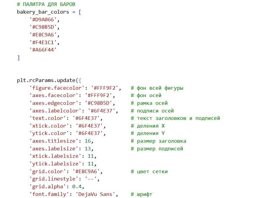 На этом этапе я настроила визуальный стиль для всех графиков исследования. С помощью параметров rcParams была задана стандартная ширина и высота фигур, шрифт и размеры заголовков и подписей осей, а также фон графиков и области построения. Я определила цветовую палитру в тёплых оттенках.