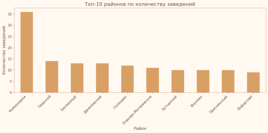 Затем я определила топ-10 районов с наибольшим количеством пекарен. Для этого был выполнен подсчёт числа заведений в каждом районе, после чего выбраны районы с максимальными значениями.