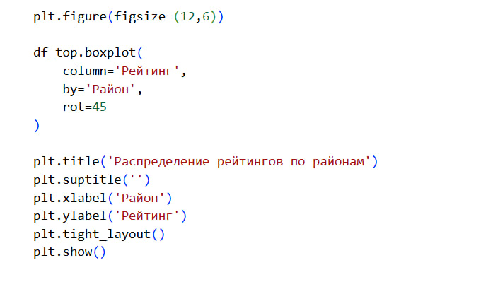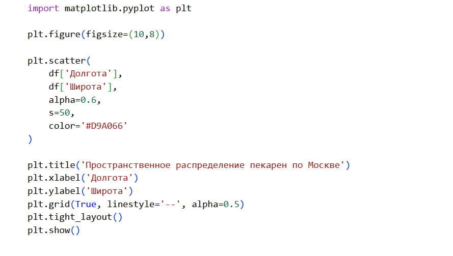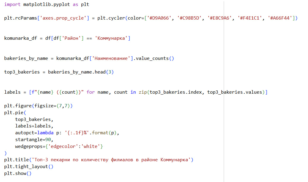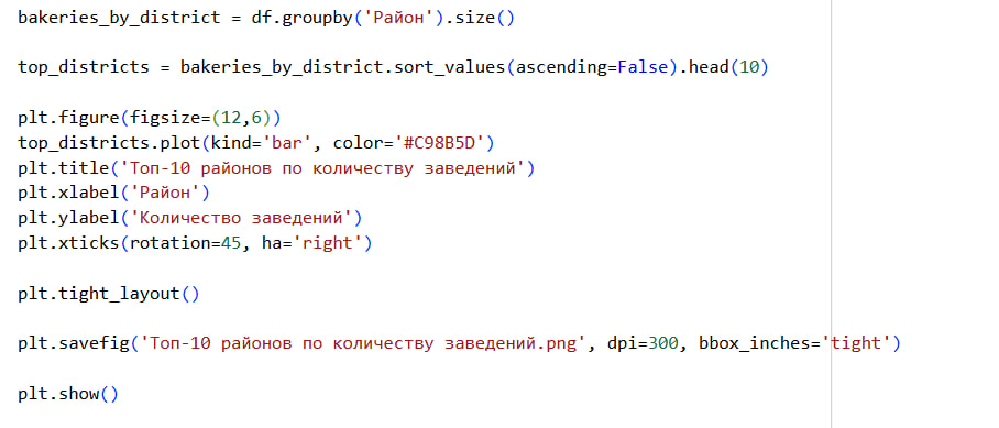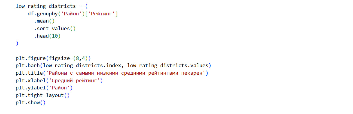 Для начала я импортировала библиотеки pandas и matplotlib.pyplot, для работы с данными и их визуализацией. После загрузки датасета я сформировала рабочую таблицу, оставив только те столбцы, которые необходимы для анализа: район расположения пекарни, рейтинг, количество отзывов, тип заведения, рубрики, а также географические координаты.