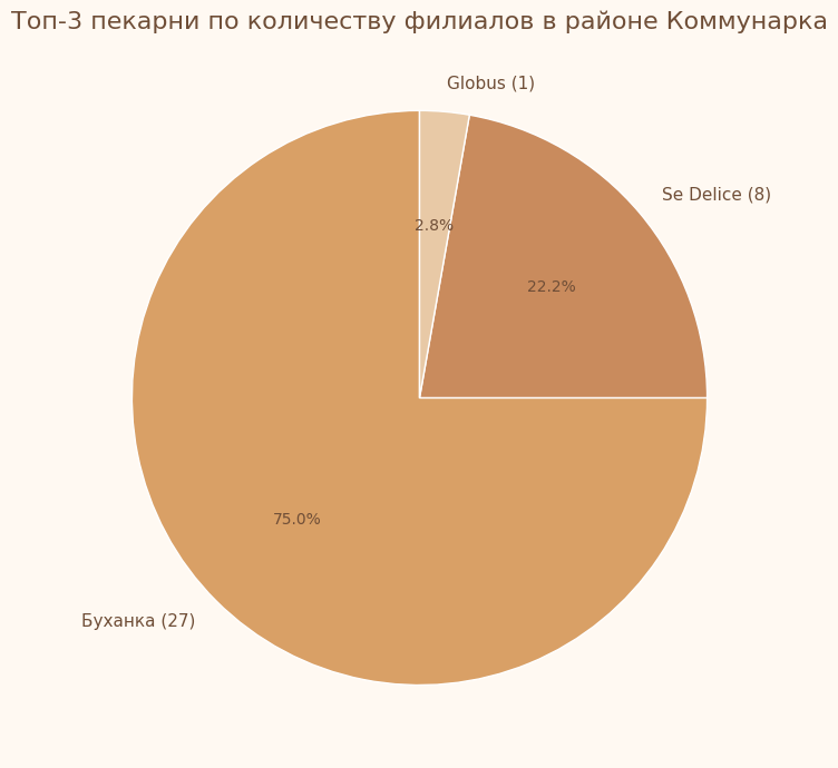 В среднем количество пекарен на один район около десяти, но район Коммунарка почему-то выделяется. Меня заинтересовало, с чем связана такая высокая концентрация заведений, поэтому я построила круговую диаграмму с распределением пекарен в этом районе, предполагая, что дело в наличии определённой сети.