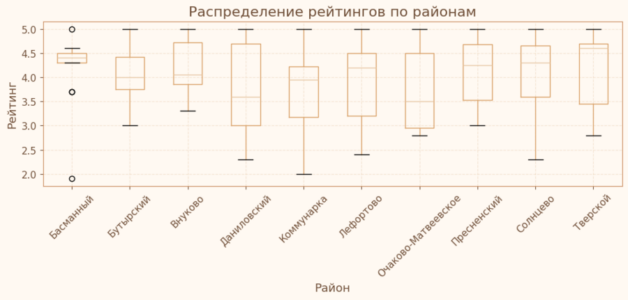 Этот график уже более подробно показывает, как распределяются рейтинги пекарен по районам города. Он отражает колебания оценок и помогает понять в каких районах пекарни исключительно высоко оценены, а в каких рынок неоднороден