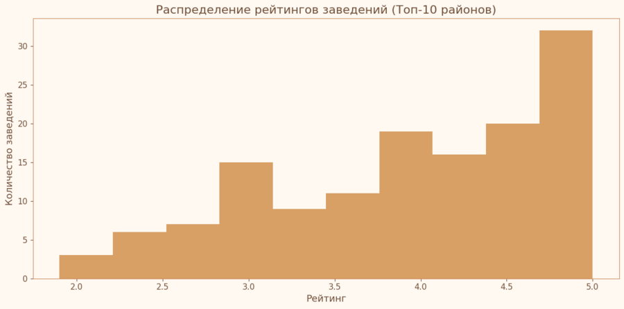 На графике десять районов Москвы с самым большим числом пекарен. Он наглядно показывает, где рынок уже перегружен и конкуренция особенно высокая, из-за чего открывать новую пекарню там сложнее. Такой график помогает понять, как пекарни распределены по городу, и служит основой для дальнейшего анализа их качества и рейтингов.