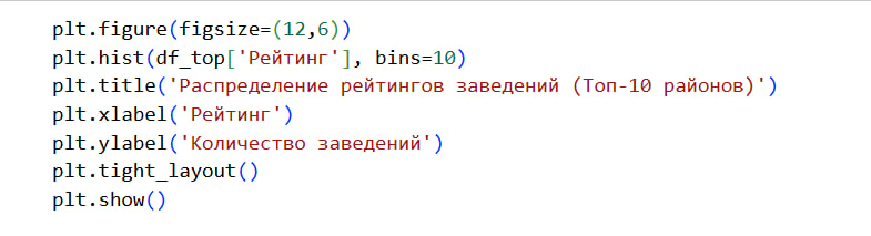 Я приступила к очистке и подготовке данных для анализа. Столбцы с рейтингом и количеством отзывов были приведены к числовому формату, чтобы их можно было корректно использовать при подсчётах и построении графиков. Все некорректные значения, которые не удалось преобразовать в числа, автоматически заменялись на пустые. Из таблицы были удалены строки без указания района или рейтинга, так как такие данные не подходят для анализа и не являются полными