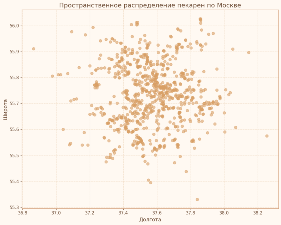Финальный график показывает расположение вообще всех пекарен Москвы на координатах, создавая своего рода карту, где каждая точка — это одна пекарня. Сразу видно, что в центре заведений много, и рынок перенасыщен а в Подмосковье их намного меньше.