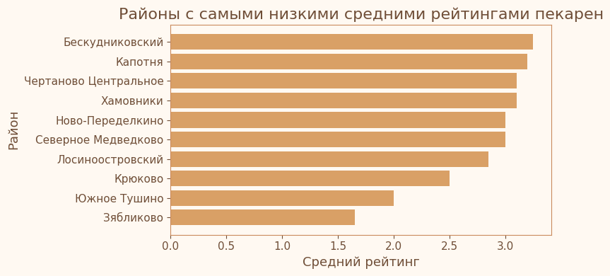 В противовес прошлым графикам, этот показывает районы Москвы с самым низким средним рейтингом пекарен. Он помогает увидеть территории, где качество заведений в среднем оценивается хуже всего. Для исследования рынка этот график помогает выделить районы, где существует потенциал для улучшения качества сервиса или появления новых, более конкурентоспособных пекарен.