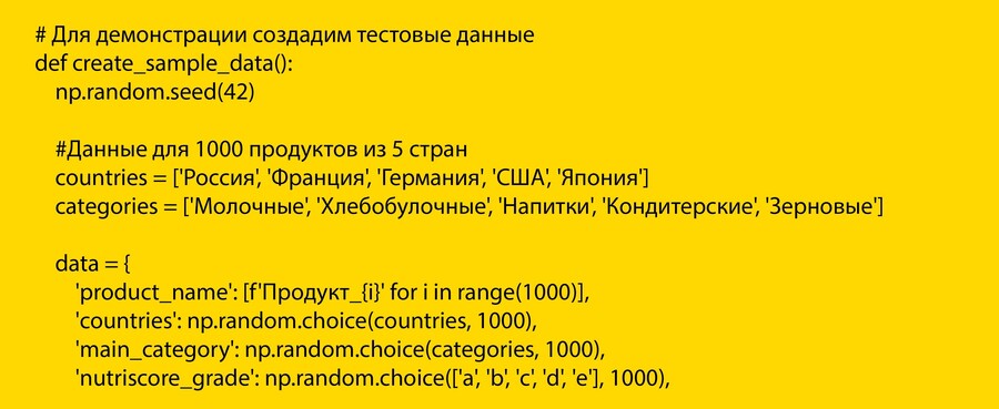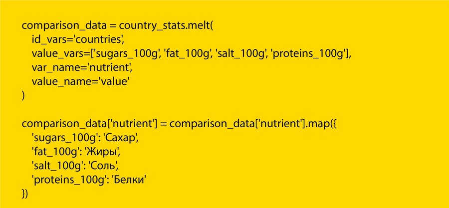 Цель использования: сравнение среднего содержания ключевых нутриентов (сахар, соль, жиры) в аналогичных категориях продуктов (например, йогуртах или хлопьях) по странам.