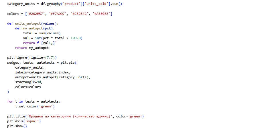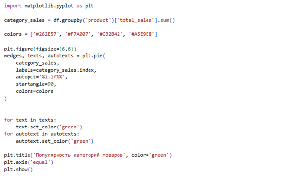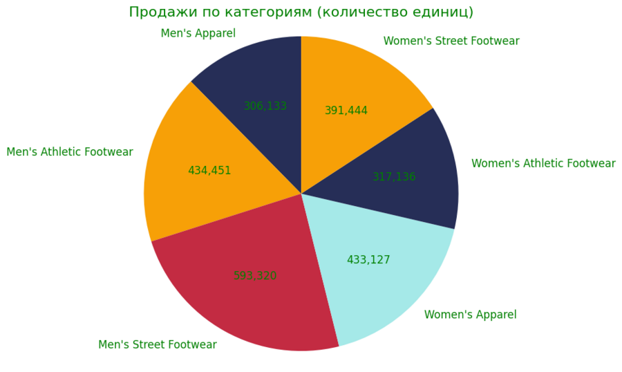 Диаграмма продаж превращает эти проценты в реальные цифры и показывает масштаб успеха. То, что женская спортивная обувь лидирует не только в процентах, но и с огромным отрывом в абсолютных числах (почти 600 тысяч пар!), говорит о её феноменальной востребованности. Фактически, она двигает весь бизнес. При этом видно, что даже самая непопулярная категория, мужская одежда, всё равно обеспечивает солидный объём продаж в 300+ тысяч единиц.