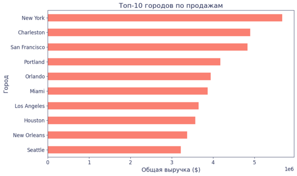 1. Топ-10 городов: Нью-Йорк — абсолютный лидер по выручке. За ним идут Чарлстон и Сан-Франциско.