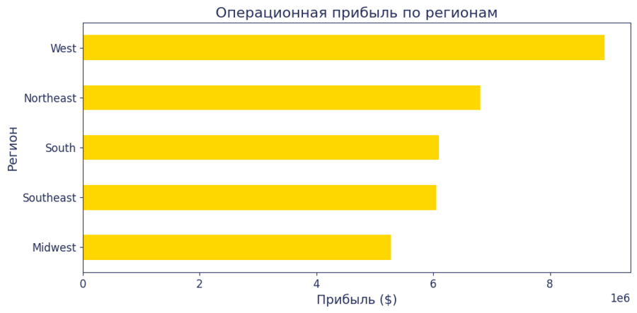 3. Прибыль по регионам: А вот по реальной прибыли лидирует уже Северо-Восток, обгоняя Запад. Это значит, что бизнес там самый эффективный и маржинальный. Южный регион тоже показывает хорошую прибыль.