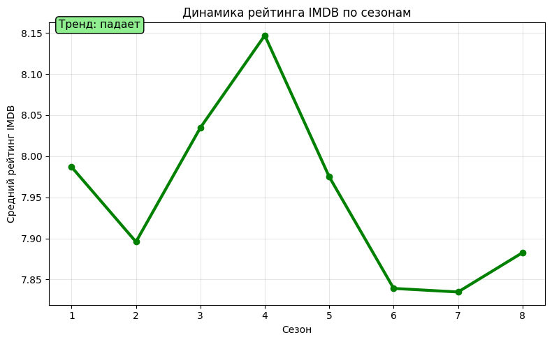 Линейный график наглядно показывает, как менялся средний рейтинг сериала от сезона к сезону. Линия позволяет сразу увидеть общий тренд: росла ли популярность сериала, оставалась стабильной или снижалась.