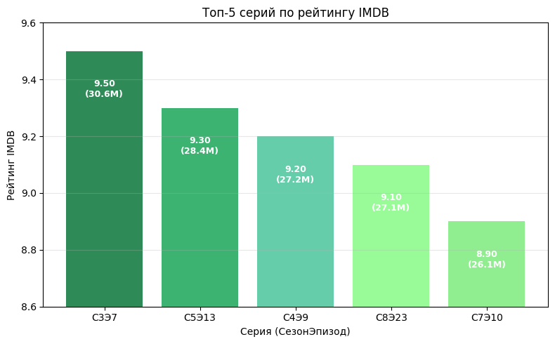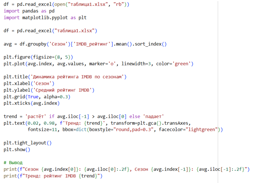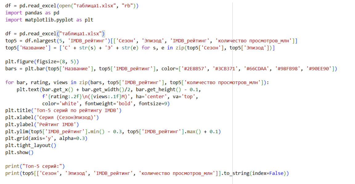 1. Столбчатая диаграмма — сравнение средних рейтингов сезонов 2. Точечная диаграмма — определение сезона с максимальными просмотрами 3. Линейный график — визуализация тренда изменения рейтинга 4. Гистограмма — отображение топ-5 эпизодов по рейтингу