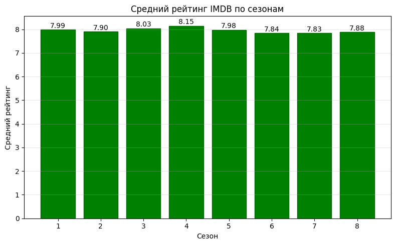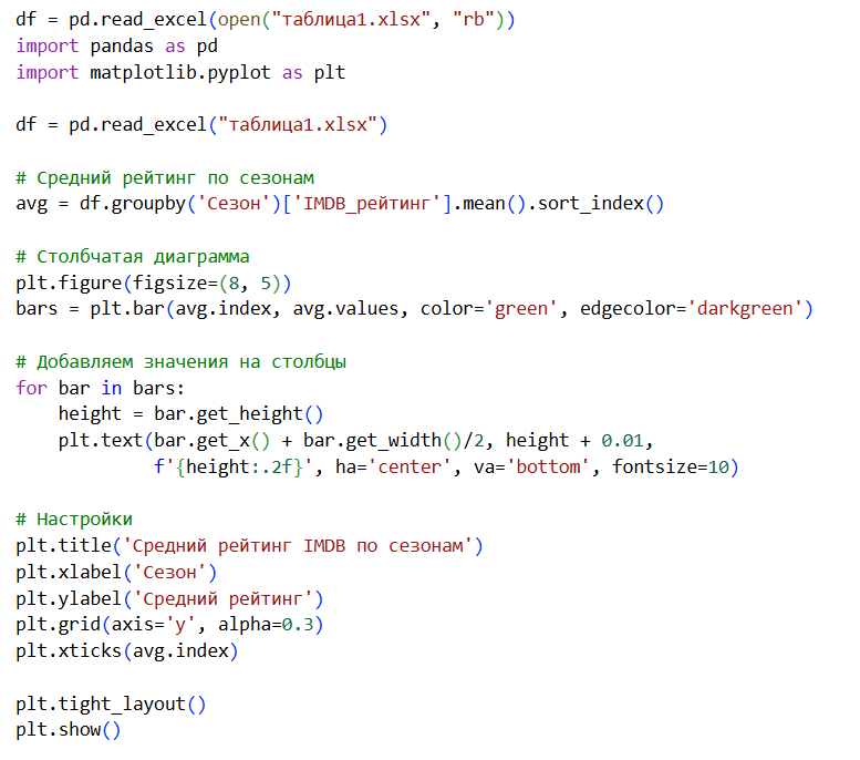Столбчатая диаграмма позволяет быстро сравнить успешность каждого сезона. По высоте столбцов легко определить, какой сезон получил наивысшую оценку зрителей, а какой — самую низкую.