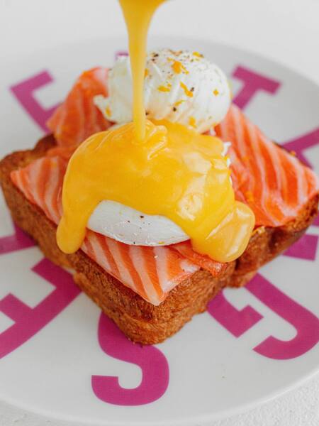 Розовый является основным цветом бренда и связан с теплом, любовью и хорошим настроением, а жёлтый отсылает к ключевому ингредиенту меню — яйцам, а именно к желтку. Эти же цвета повторяются в логотипе, символизирующем яйцо.