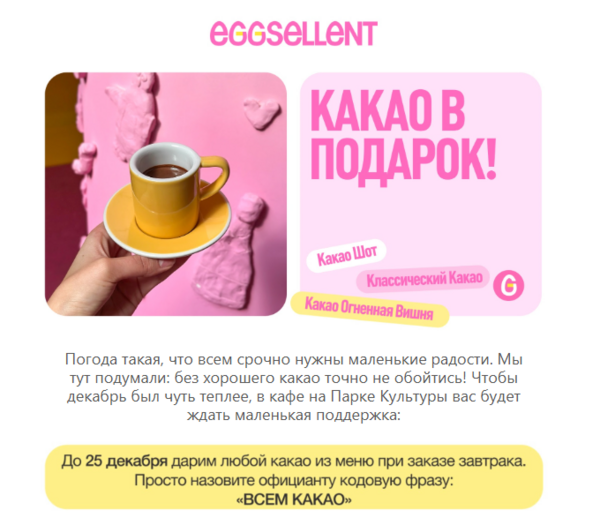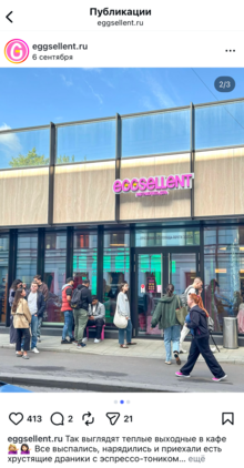Eggsellent последовательно поддерживает свои архетипы, создавая креативные коммуникации и совершенствуя клиентский сервис. Об успешности концепции свидетельствует появление кафе-двойников, стремящихся повторить формат.