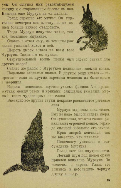 Основой для этого была кропотливая работа с натуры. Как и многие анималисты его круга, Чарушин был частым гостем в Московском зоопарке, который, по словам Портновой, из «увеселительного учреждения» превратился в «научную лабораторию», предоставившую художникам «широкое поле деятельности… где они могли с натуры рисовать зверей и птиц». [6] Образ Чарушинского зверя — это уникальное сочетание графического мастерства и эмоционального понимания живого мира, умение видеть живую природу глазами ребенка.