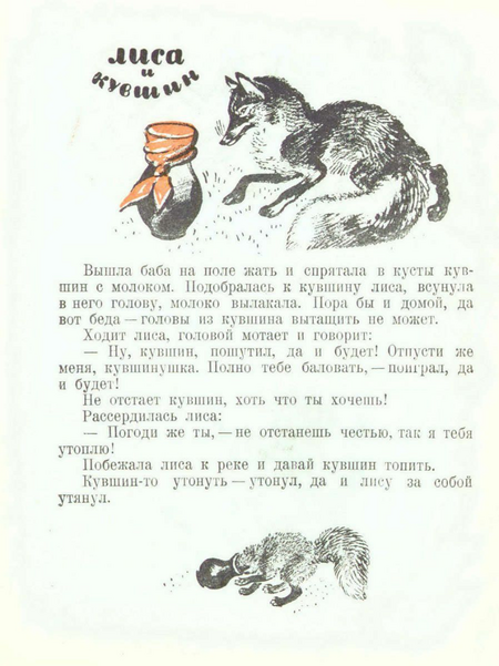1. «Лиса и рак», Русские сказки про зверей, Детгиз 1947 г. 2. «Лиса и кувшин», Русские сказки про зверей, Детгиз 1947 г.