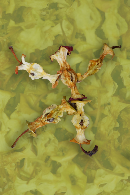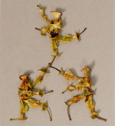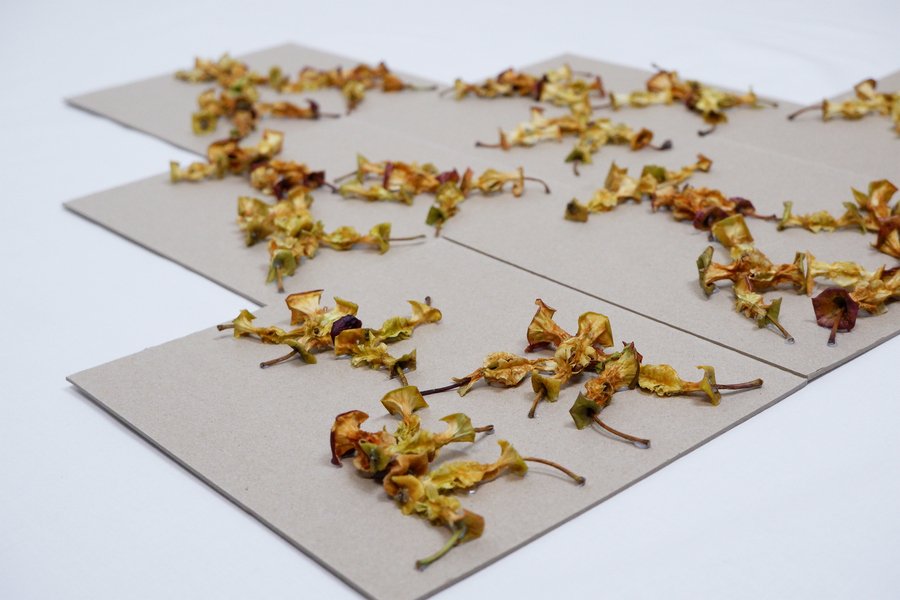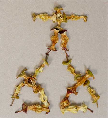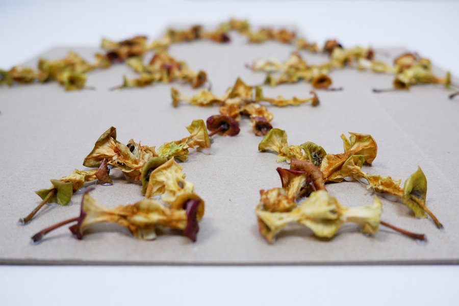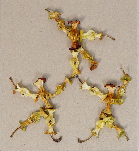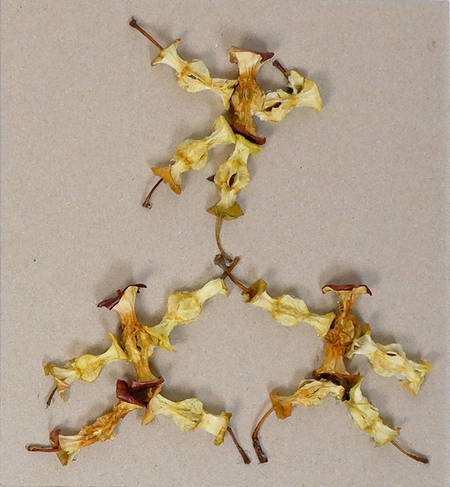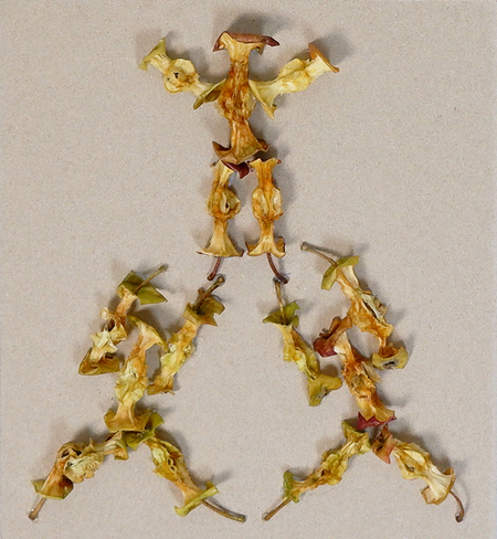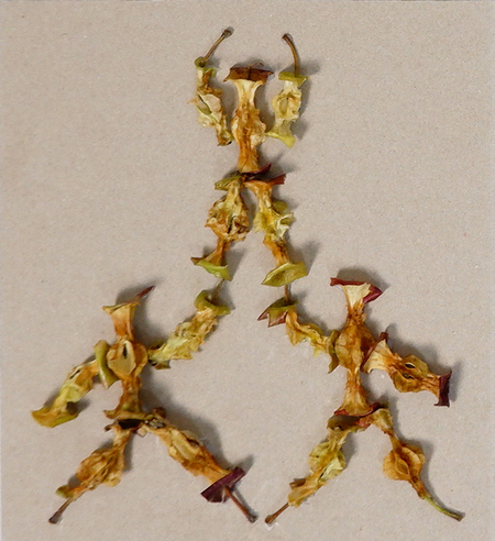 Серия фигур из высохших яблочных огрызков фиксирует человека как конечный и уязвимый объект, подвергшийся эксплуатации и обесцениванию личности.