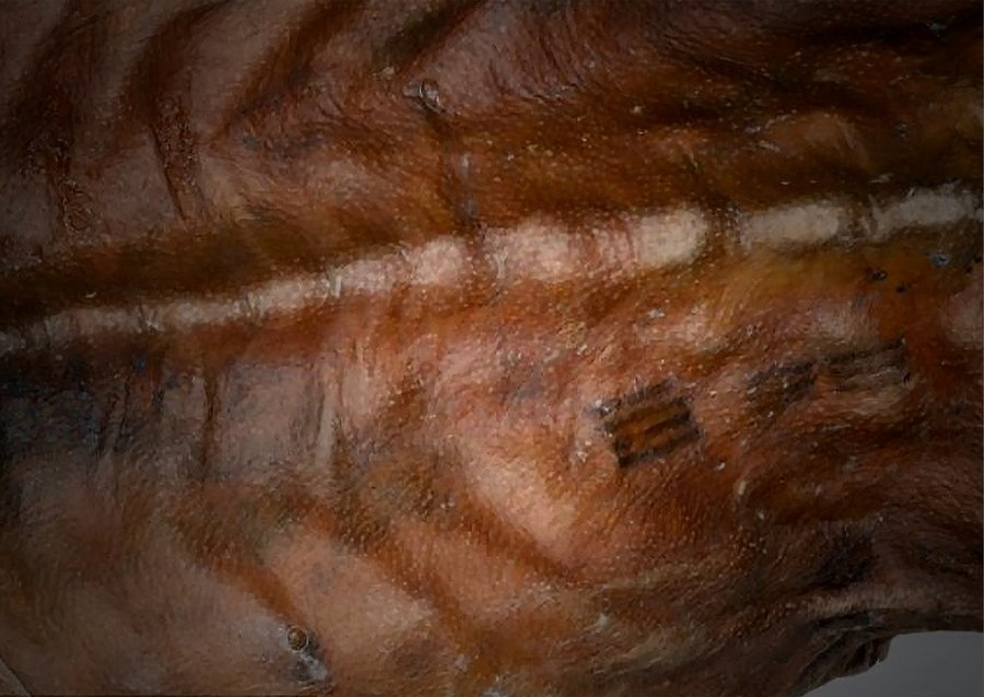 На теле у мумии обнаружено около 30 татуировок, и особый интерес вызывают изображения в области шеи. Эта зона человеческого тела является наиболее чувствительной к боли. То, что женщина добровольно вынесла эту процедуру, может говорить о том, что эти узоры были больше, чем просто украшения. Они были актом посвящения и инструментом магии. Это была добровольная жертва, трансформирующая ее физическое тело в освященный объект.