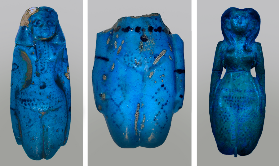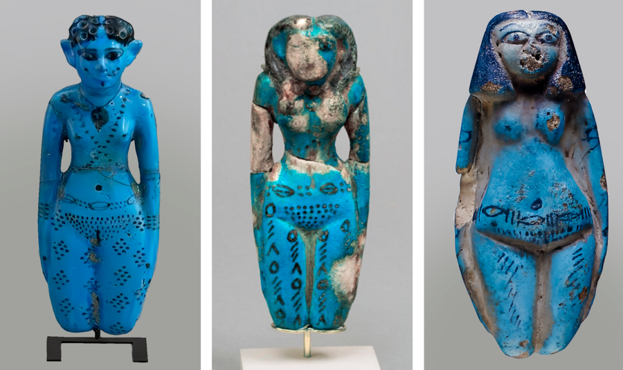 Изучить композицию и месторасположение татуировок позволяют фаянсовые фигурки женщин, покрытые синей глазурью, которые также причисляются к культу богини Хатхор. Узоры в основном сосредотачивались в области лобка, низа живота, бедер, вокруг грудей — то есть непосредственно на зонах детородных органов.