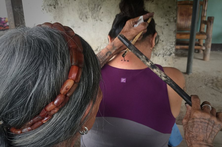 Интересен метод нанесения татуировок женщины. Апо Ванг-Од не использует современное оборудование, она работает в технике «баток»: вручную выстукивает узор, используя специальную палку с острым шипом, по которой ударяет бамбуковым молоточком. Эта техника практически идентична той, что применялась в древнем мире. Кроме того, в качестве краски Ванг-Од использует разведённую в воде сажу, что схоже с татуировками Этци, для которых тоже использовался этот природный пигмент.