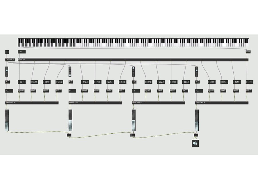 Использованные объекты: toggle transport kslider number gate metro button radiogroup flonum cycle~ saw~ rect~ tri~ selector~ gain~ ezdac~