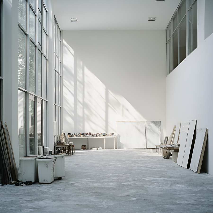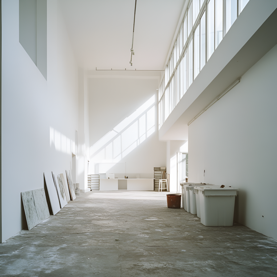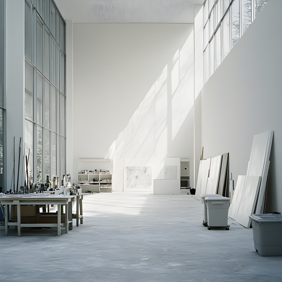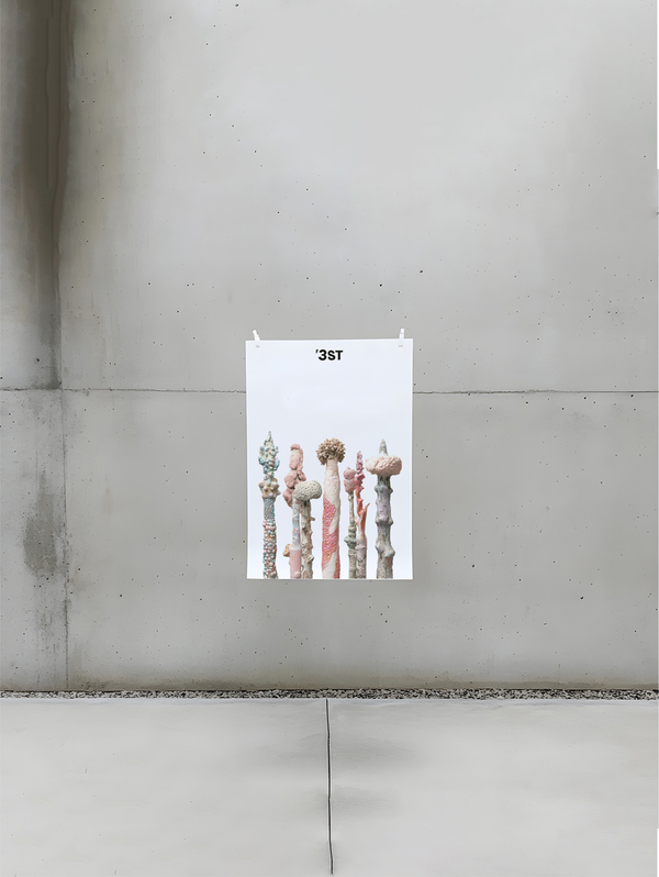PROMPT: Poster on the floor stone floor white wall, calm mood, white poster with the logo «3ST» and «This is a school for people of experimentation»