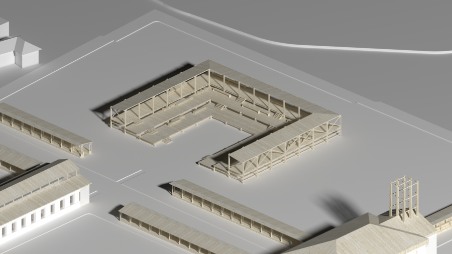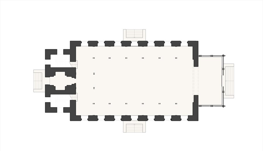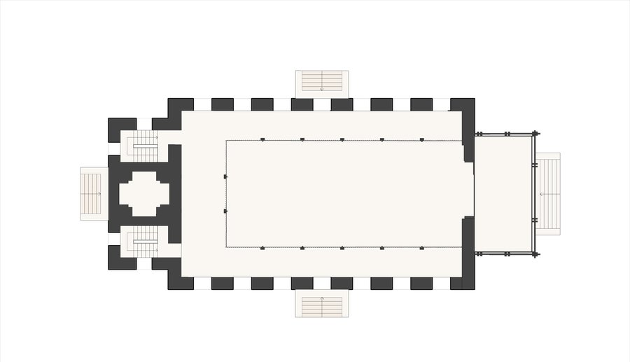 таким образом, внутри здания формируются лестница, хора, каркас крыши и четырехскатная кровля для наиболее полного ощущения пространства прошлого и наименьшей интервенции. унификация пространства позволяет использовать место для мероприятий с целью объединения людей.